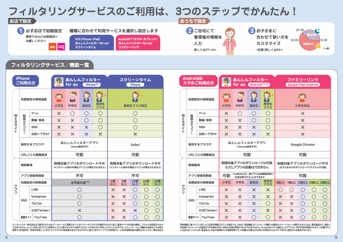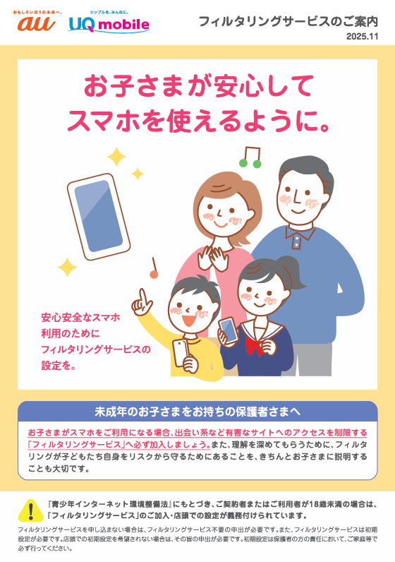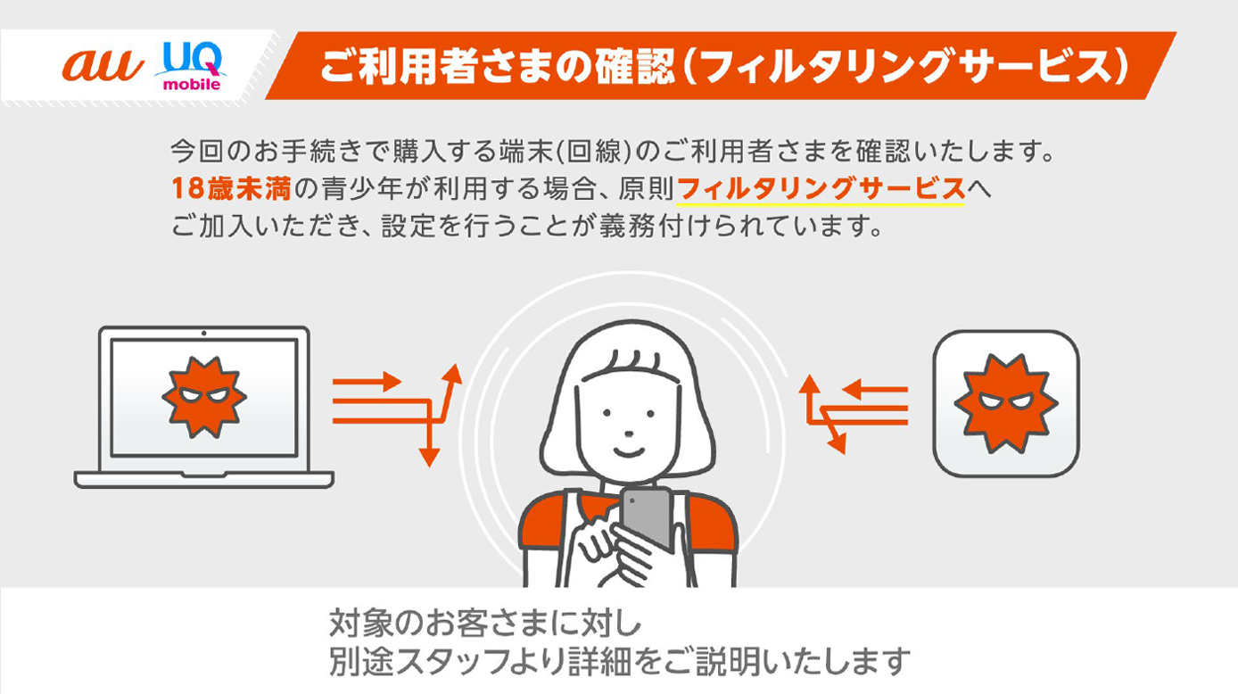 ご利用者さまが未成年の場合には、インターネットをあんしんしてご利用いただくために、ご契約者さまへ「未成年WEBフィルター」をデフォルトで設定するとともに、「あんしんフィルター for au」、OS事業者が提供するフィルタリングサービス(スクリーンタイム、ファミリーリンク)のご利用方法・設定方法を、ご契約時に加え、ご利用開始後一定期間ご案内しています。