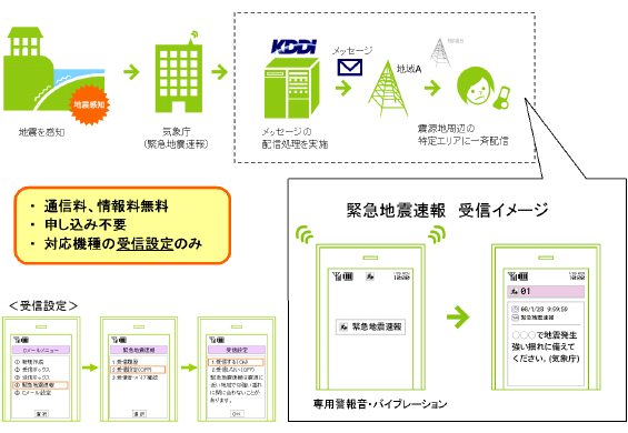 - 気象庁が配信する緊急地震速報を、輻輳 (ふくそう) の影響を受けずに震源地周辺エリアの対応au携帯電話に、一斉配信するサービスです。