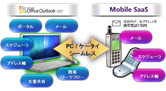 会社のメールアドレスをau携帯電話でも使え、スケジューラ閲覧、アドレス帳利用が携帯・PC問わず、シームレスに利用可能な環境を提供します。