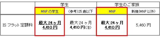 今回新たに、MNPで対象のauスマートフォンをご購入いただき、「ISフラット」へお申込みいただいた「学生のご家族」は、「ISフラット」の定額料が通常5,460円 (税込) のところ、最大2年間実質4,410円 (税込) でご利用いただけます。また、MNPでご契約いただいた26歳以上の学生の方にも同様の割引を適用します。