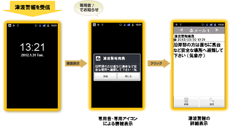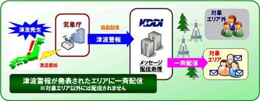 緊急速報メール「津波警報」では、津波による災害の発生が予想される場合に気象庁が発表する津波警報 (大津波、津波) を、対象沿岸地域を含むエリアにいるお客さまにお知らせします (注1) 。