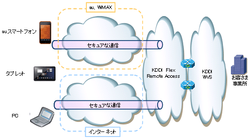 - 1つのIDで様々なデバイスからインターネットやau、WiMAXなどのネットワークを経由して、「KDDI Wide Area Virtual Switch」(以下KDDI WVS) との接続により社内イントラネット等へセキュアな通信環境でアクセスが可能。