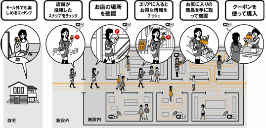 モール内のお客さまに対し、イベント情報や特集、クーポン等、お買い物に役立つお得な情報を配信します。また、モール外のお客さまに対しても、属性や嗜好に合わせた情報を配信し、お客さまの再来店を促します。