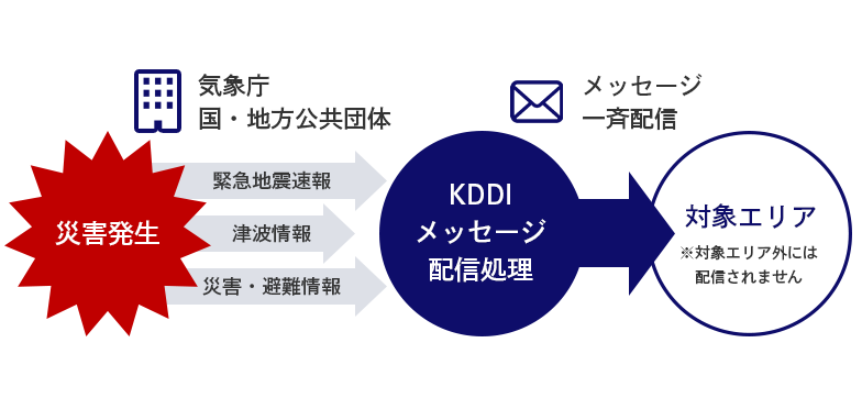 国や地方公共団体が配信する災害・避難情報を、特定エリアのau携帯電話に一斉にお知らせするサービスです。