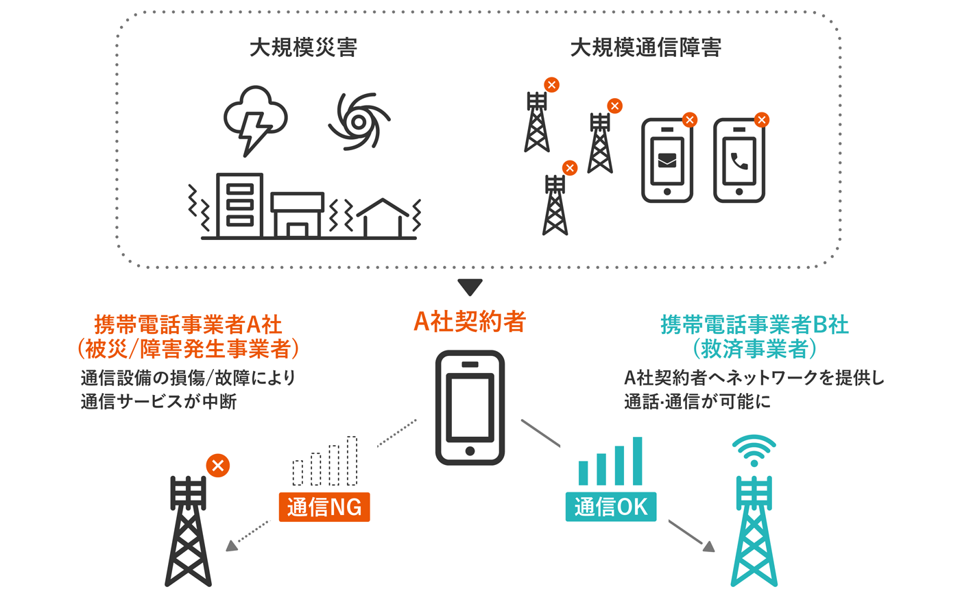 ご契約されている携帯電話事業者(被災事業者)のネットワークが災害などで利用できなくなった場合に、ほかの携帯電話事業者の4G回線設備に切り替えて、通信を可能とします。