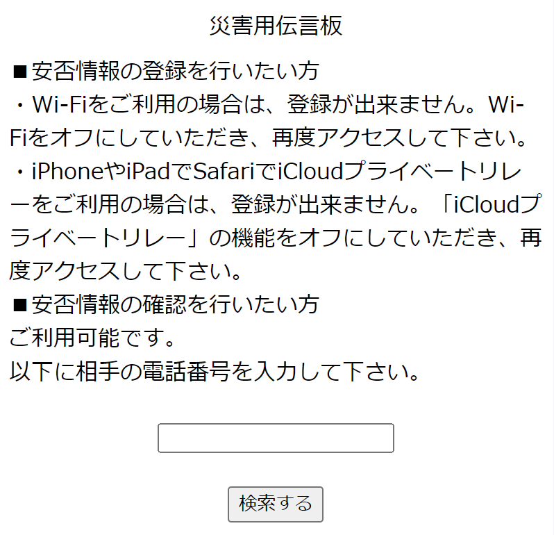 災害用伝言板とは、大規模災害発生時に、災害発生地域にお住まいのお客さまがご自身の安否情報を登録・確認することが可能なサービスです。UQ/povoをご利用のお客さまは【1】web171をご利用ください。