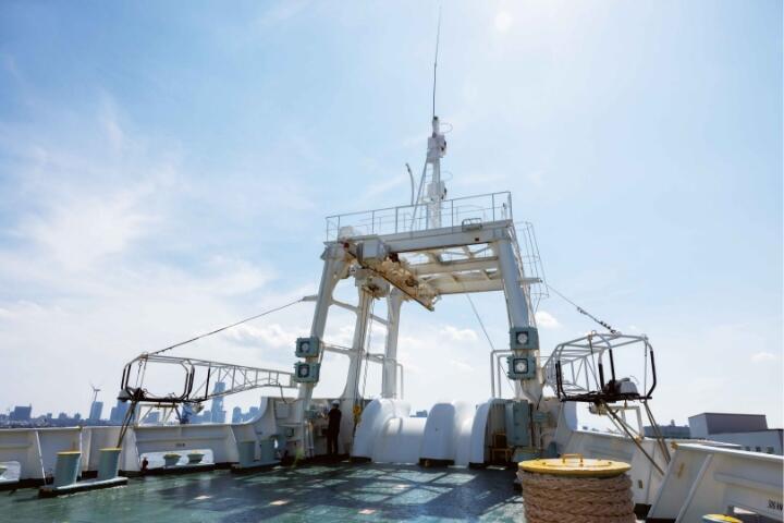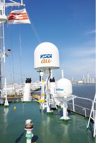 また、高精度なDGPSと船体に装備された5基のスラスタプロペラによって、潮流や風波の影響を受けることなく、より正確な位置にケーブルを敷設することができます。船舶型基地局も搭載され、災害時には海上からau携帯電話の通信をつないでいます。