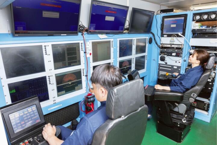 ケーブルシップには、水中ロボットが搭載されています。2,500mの深さまで潜り、障害が起きた海底ケーブルの探査から掘出、切断、船上への引き揚げ支援および、ケーブル修理後の埋設までを一手に行います。