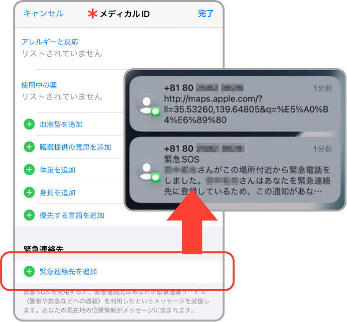 緊急連絡先を追加しておくと、テキストメッセージと最新の位置情報が通知されます。
