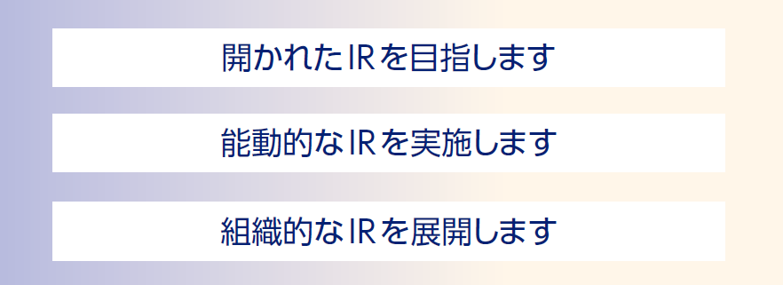 KDDIは、以下の活動指針に基づいたIRを実施することで、株主・投資家さまとの長期的な信頼関係を構築し、企業価値の最大化を図ります。