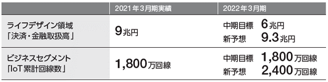 成長領域であるライフデザイン領域とビジネスセグメントの売上高・営業利益は堅調に拡大しており、中期目標として掲げた目標のうち、ライフデザイン領域では「決済・金融取扱高」、ビジネスセグメントでは「IoT累計回線数」を前倒しで達成しました。