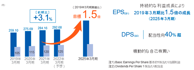 2019年5月に発表した中期経営計画では、持続的な利益成長をベースとして、2025年3月期のEPSを2019年3月期対比で1.5倍に拡大することを目標に掲げています。