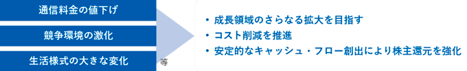 通信料金の値下げや競争環境の激化、新型コロナウイルス感染症による生活様式の大きな変化などの環境変化を事業機会と捉え、成長領域のさらなる拡大、構造改革を伴うコスト削減の推進、安定的なキャッシュ・フローを強みとした成長投資と株主還元の強化など、あらゆる努力を尽くし持続的成長と株主還元強化の両立を目指します。