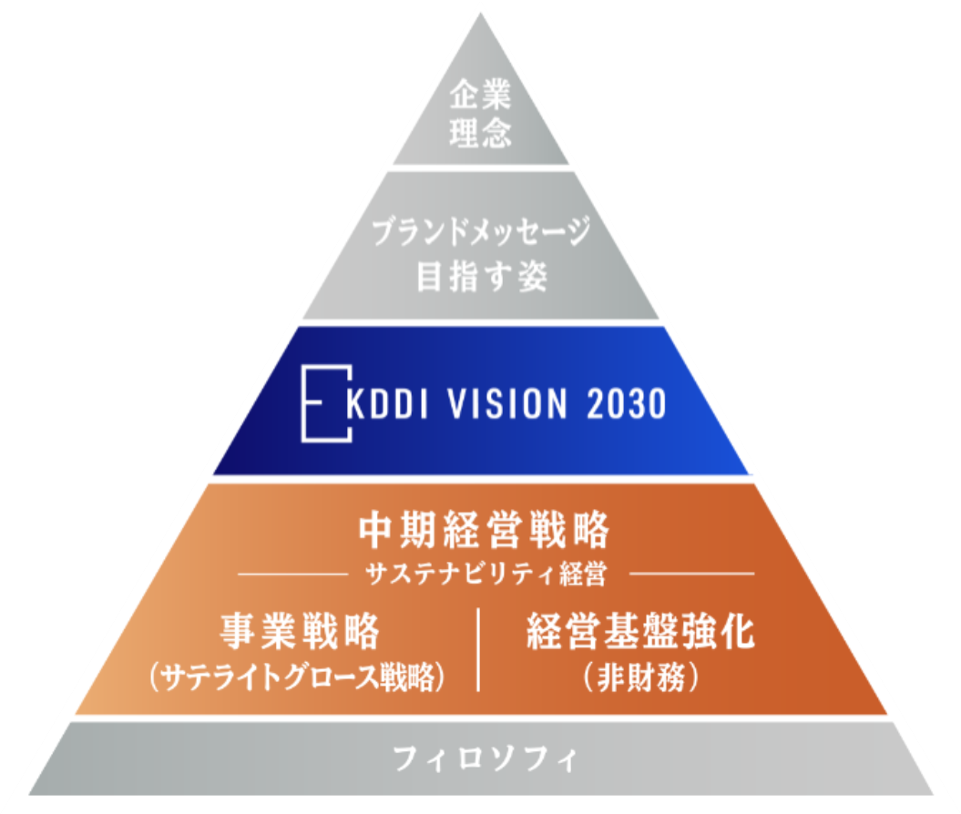 また、新サテライトグロース戦略の推進とあわせて、「To Global グローバルへの拡大」「With Life もっとお客さまに身近な会社へ」「For Future 未来人財・スタートアップ育成」をテーマに未来への取り組みを進めることで、「KDDI VISION 2030」の実現を目指します。