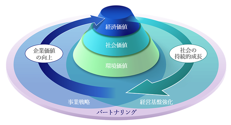 当社グループの中期経営戦略では、パートナーの皆様とともに社会の持続的成長と企業価値の向上を目指すサステナビリティ経営を根幹に置き、社会の成長が次の当社の事業戦略に活かされ、そして再び社会に還元される好循環を目指します。
