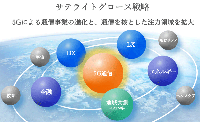 新サテライトグロース戦略では5G通信をベースとし、データドリブンの実践と生成AIの社会実装を進めるコア事業を中心に、これと連携して当社の成長を牽引する事業領域「Orbit1(DX/金融/エネルギー)」と、新たな成長に挑戦する事業領域「Orbit2(モビリティ/宇宙/ヘルスケア/Web3・メタバース/スポーツ・エンタメ)」に取り組み、さらなる事業拡大を推進します。