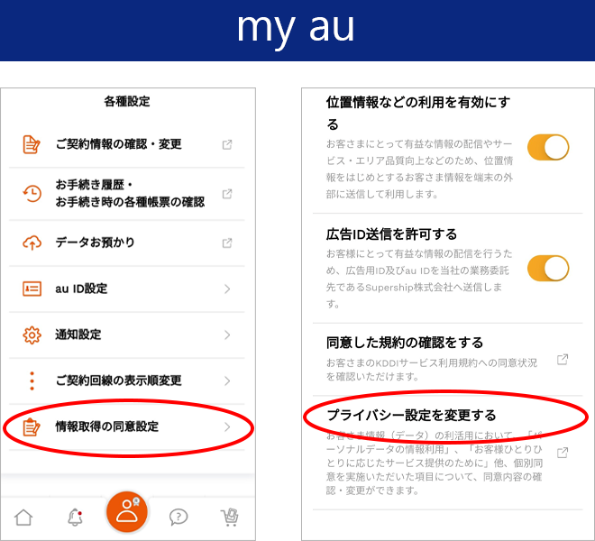 位置情報とは、お客さまがご利用されるスマートフォン等のモバイル端末の位置を示す情報 (緯度・経度等) のことです。KDDI株式会社と沖縄セルラー電話株式会社 (以下、「当社」といいます。) が取り扱う位置情報は、主に3種類ございます。当社が通信サービスのみを提供する場合などを除き、お客さまからの同意を得た上で、位置情報を取り扱います。