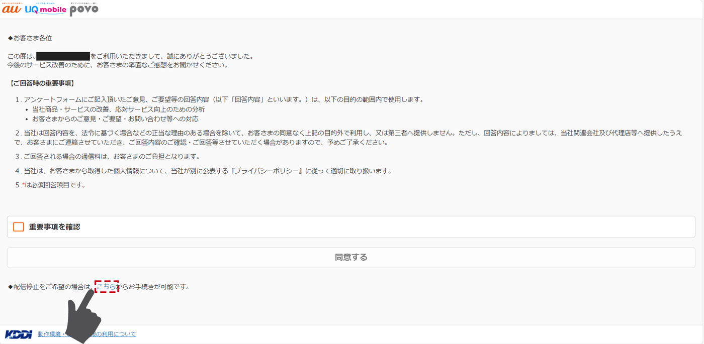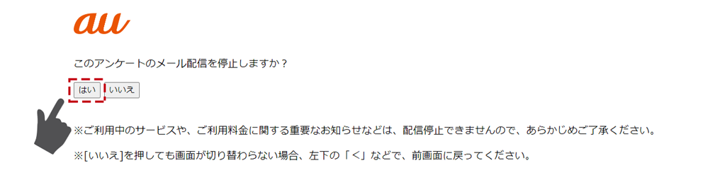 「このアンケートのメール(またはSMS)配信を停止しますか?」というページが表示されましたら、「はい」をクリックしてください。