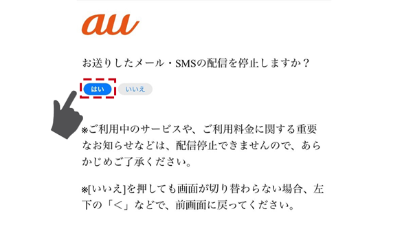 「お送りしたメール・SMSの配信を停止しますか?」というページが表示されましたら、「はい」をクリックしてください。