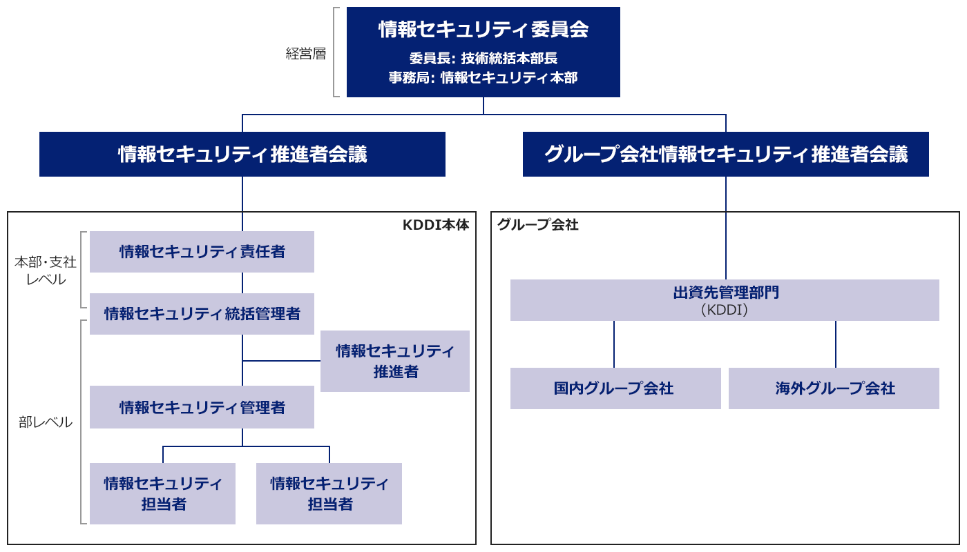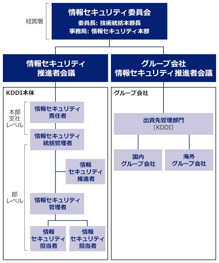 情報資産に関わるKDDIグループ全体での統一的な情報セキュリティの確保を目的に、代表取締役社長を委員長とした「リスクマネジメント委員会」配下に「情報セキュリティ部会」を設置し、経営層および営業・技術・コーポレートの各部門長を構成員とする全社的な組織体制で運用しています。この体制により、情報セキュリティの管理状況を的確に把握するとともに、情報セキュリティ強化のための各種施策をKDDIグループ全体に迅速に展開できる体制を整備しています。