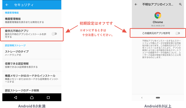 なお、Android スマートフォンの初期設定で「提供元不明のアプリ」/「不明なアプリ」はインストールができない設定となっており、インストールする際には警告が表示されます。「提供元不明のアプリ」や「この提供元のアプリを許可」の設定をオンにすることでインストール可能となりますが、通常の利用においてはオンにする必要はありません。
