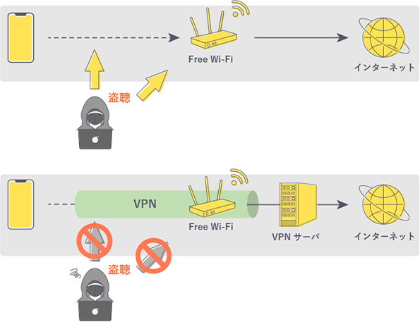 公衆Wi-Fiは多くの人がWi-Fiを共有してインターネットに接続します。そのため十分なセキュリティ対策がなされていないWi-Fiでは第三者に送受信するデータを盗聴される可能性があります。このような環境でも安全にWi-Fiを使う方法として、VPNを利用することで通信を保護する方法があります。VPNでは仮想的に構築された専用ネットワークで通信が行われるため、第三者に送受信するデータの盗聴を防ぐことができます。