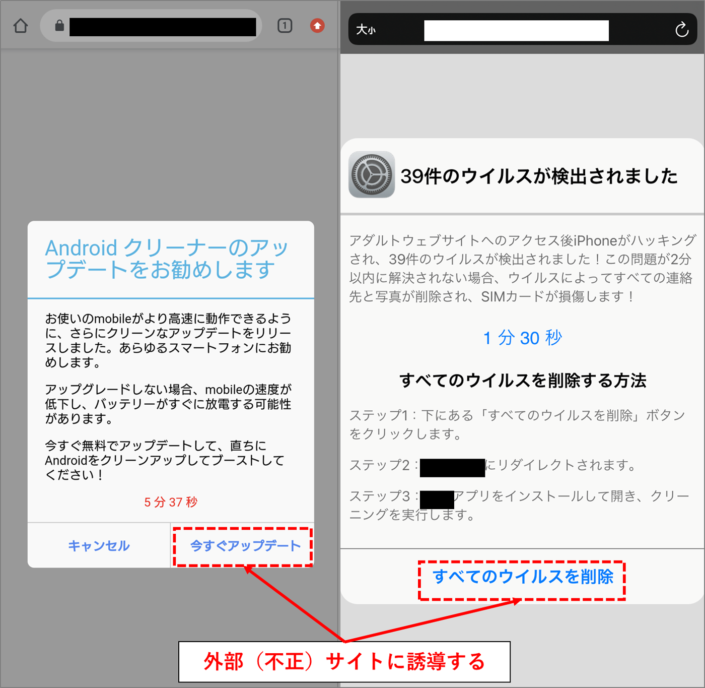 Webサイトの閲覧中に突然“ウイルスに感染しています”などの警告が表示されることがあります。これは、不正なアプリのインストールを促すページや個人情報を取得するページへ誘導するための偽警告です。このような表示が出た際にはページを閉じて、それ以上アクセスしないようにしてください。