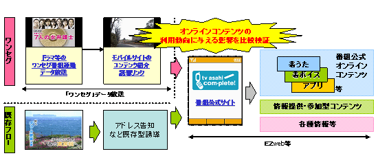 木曜ドラマ「7人の女弁護士」(毎週木曜21時〜21時54分) ほか番組連動データ放送を付与する番組にて、テレビ朝日の携帯サイト「テレ朝コンプリート」などで展開するオンラインコンテンツとの連携を行い、オンラインコンテンツの利用動向に与える影響を検証します。