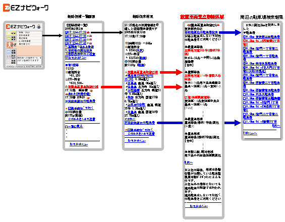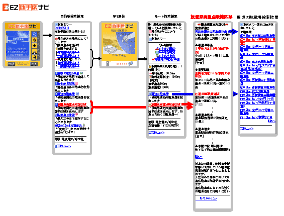 「EZナビウォーク」において、「車ルート検索結果」画面より、直接「周辺の駐車場検索」のご利用が可能となります。また、これまでケータイ向けのみであった駐車場満空情報をPCからもご確認いただけます。
