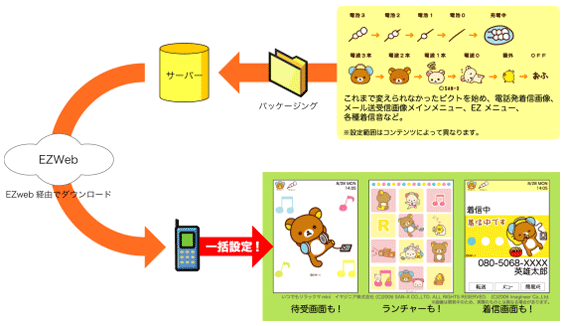 待受画面やメインメニュー、ピクトアイコンといった画像系素材から、電話着信音、メール着信音といった音系素材まで1つのパッケージでダウンロードして、これまでの着信音や待受画面の設定と同等の操作で、画も音も一括着せ替えが可能です。