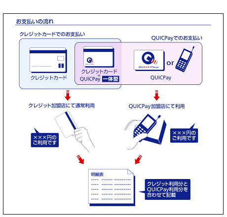QUICPayのご利用分は、申込み時に登録いただいたクレジットカードにて、他のご利用分と合算されて後日請求されるため、ご利用者にとってはポイントやマイルを効率よく貯めていただくことができるなど、クレジットカードに付帯するサービスもそのまま享受できます。また、後払いとなるため、プリペイド方式の様に支出用途を固定されたり、お手元の現金の流動性も損なわれません。これらの意味でも、クレジットカードの利点を最大限に活かした決済サービスとなっております。なお、QUICPayが管理している与信枠 (累積利用限度額) が不足した際には、店頭の専用端末等で与信枠の自動更新を行いますので、プリペイド方式のように利用者自身がチャージを行う手間が不要で、利用者の利便性が飛躍的に向上しています。
