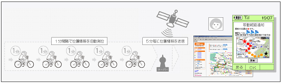 「ジュニアケータイA5525SA」・「Sweets cute」には、お子様の異常を察知したとき、どこに居るのか、どこへ向かっているのか、といったご家族の不安を緩和するための「移動経路通知」を搭載しました。「移動経路通知」が起動すると、現在地の測位を1分間隔で連続的に行い、当社のサーバーに通知します。位置情報はサーバー上に時系列に沿って保存されるため、登録された携帯電話やパソコンから地図上でどのような経路をたどって移動しているか簡単にご確認いただくことができます。また、「緊急通知機能」として、「移動経路通知」と連動して自動的に写真を撮影し、ペア登録相手のEメールアドレスに写真を送付する「自動写真撮影」や、ペア登録相手に自動的に電話をする「自動通話発信」も搭載しています。
