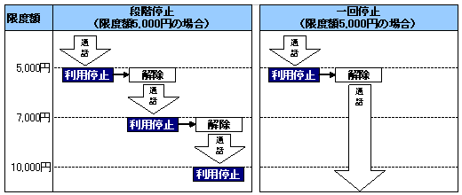 あらかじめ選択頂いた限度額に達した後でも段階的に発信規制をかけることができる段階停止方式を新設します。選択いただいた限度額を超過した場合に、超過したことをお知らせするEメール通知の翌日に発信の規制を行います。その後、発信規制を解除した場合でも、次の限度額を超過した場合に再度発信規制を行います。再度発信規制がかからない現状の停止方式は「一回停止」として引き続き提供いたしますので、お客様の使い方に合わせた停止方式の選択が可能になります。