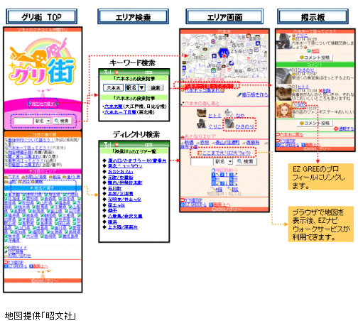 「グリ街」では、全国の注目エリアごとの掲示板で、飲食店や口コミ情報をお客様同士が自由に書き込んだり、閲覧していただけるコミュニティ機能に加え、「EZナビウォーク」(注) と連携することにより、興味を持った場所まで簡単にルート案内サービスがご利用いただけます。
