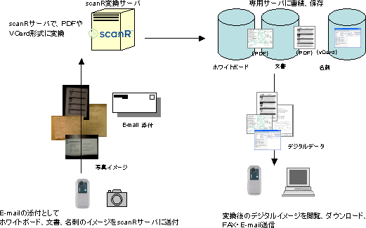 「スキャンR」は、携帯電話のカメラで撮影したホワイトボード上の文字や文書、名刺等の画像データをPDFファイルや携帯電話のアドレス帳ファイルにて専用サーバーに保存し、閲覧したりFAXやメールによる配信が可能となります。また名刺情報は携帯電話のアドレス帳へ速やかに登録できるため、情報の共有化に加えて業務の効率化が図りやすくなります。