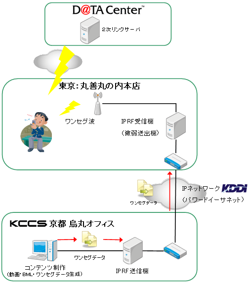 また、併せて、放送通信融合の新たな取り組みとして、KDDI株式会社 (本社: 東京都千代田区、代表取締役社長兼会長 小野寺 正、以下 KDDI) と共同で、京都に関連するオリジナルのスポットワンセグ映像 (注3) を長距離リアルタイム送信する実験を実施いたします。本実験は、京都の紅葉や本催事で販売する商品取扱店舗の紹介映像を基に京セラコミュニケーションシステム株式会社 (本社: 京都市伏見区、代表取締役社長 小林 元夫、以下 KCCS) の京都烏丸オフィスで制作したワンセグ映像を、KDDIが開発した「ワンセグ・IR/RF変換技術 (注4)」を用いて、IP網によりリアルタイムで送信し、遠隔地である東京の「丸善書店丸の内本店」で、地上デジタル放送規格に準拠したワンセグ信号へと変換し、スポットワンセグを視聴できるものです。このようにワンセグ映像を長距離リアルタイム伝送して視聴いただく取り組みは、日本初です。