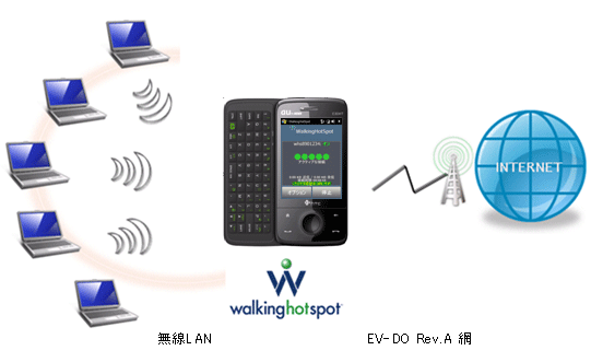 「WALKINGHOTSPOT ®」は、アクセスポイントとして最大5台の無線LAN機器を接続するアプリケーションです。出張などで複数のメンバーでPCなどを利用したい場合でも「E30HT」1台でインターネット環境を共有できます。
