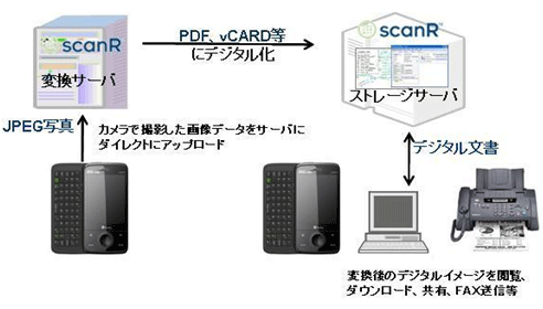 scanRSMは、印刷された文書に含まれる情報をデジタルデータとして取り込むことを可能とするサービスです。カメラで撮影されたデジタルデータは加工され、Eメール・FAXで送信や、オンラインサーバーにアップロードして、保管・共有することが可能です。本機能は「E30HT」にプリインストールされており、パケット通信料のみで利用できます。