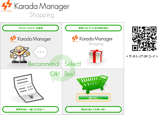 ダイエットやメタボ解消、エイジレスなカラダづくりなど、さまざまな「なりたいカラダ」づくりをサポートする「Karada Manager」がオススメする健康食品や健康グッズなどを、「au Shopping Mall」内に出店する「Karada Manager Shopping」から直接購入できます。お支払いは、月々の携帯電話料金とまとめてお支払いいただけます (注4)。