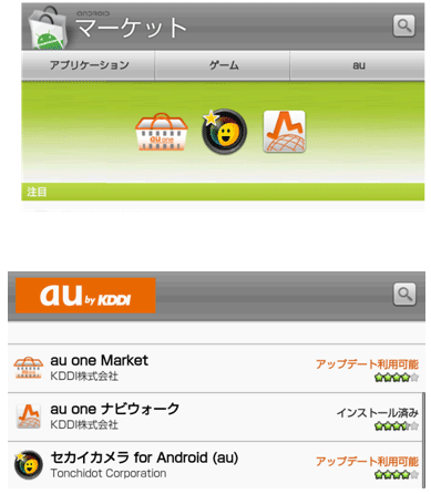 auの「Android™搭載スマートフォン」向けに提供している「Android™ マーケット」において、auがお薦めするアプリケーションを紹介する「auタブ」を開設します。これにより、お客さまは、数多くのアプリケーションが配信される「Android™ マーケット」において、「au one Market」や「au one ナビウォーク」など、auがお勧めするアプリケーションを簡単・便利に探すことができます。