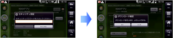 セキュリティパスワード (初期値は、auの契約時に設定したネットワーク暗証番号と同一) を入力するだけで、有料アプリケーションの購入が可能です。