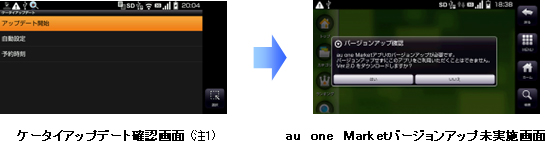 また、「au one Market」バージョンアップ確認画面が表示された場合は、「au one Market」のバージョンアップ画面に遷移しますので、「au one Market」のバージョンアップを実施してください。
