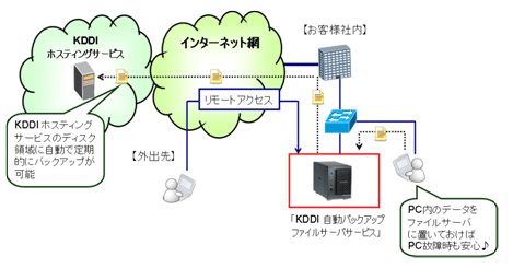 お客さまの社内において、PC上のデータを遠隔で保管できるファイルサーバを月額レンタルで提供します。また、「KDDI ホスティングサービス」と連携した自動バックアップ機能や、外出先からのリモートアクセス機能も具備されており、データ保全性の確保やお客さまの業務効率向上が図れます。