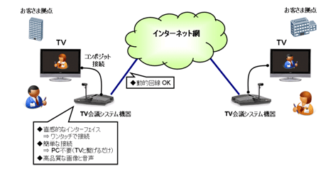 ボタン一つのワンタッチで接続が行えるTV会議システム機器を月額レンタルで提供します。接続設定が入った状態でお客さまに提供するため、お客さまはTVとインターネット回線に接続するだけで簡単にTV会議を利用でき、容易に社内コミュニケーションの向上が図れます。