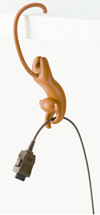 床やテーブルの上に、つい無造作に転がしておきがちなACアダプターのコードを、おサルがしっぽでテーブルにぶらぶらとぶら下がりながらもっていてくれるコードホルダー。