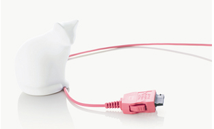所在なく転がるACアダプターのコードを、動くものが大好きな猫がじゃれつきながらつかまえていてくれる、かわいいコードホルダー。そのほんわりとしたたたずまいは、机の上に置いておくだけで和やかな気持ちにさせてくれます。