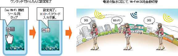 また、電波の強さに応じて自動でWi-Fiと3Gを切替えるため、お客さまは意識することなく快適な通信をご利用いただけます。