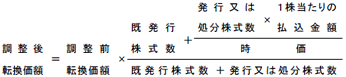 (イ) 各本新株予約権の行使に際しては、当該本新株予約権に係る本社債を出資するものとし、当該本社債の価額は、その額面金額と同額とする。 (ロ) 転換価額は、当初、当社の代表取締役又は代理人が、取締役会の授権に基づき、投資家の需要状況及びその他の市場動向を勘案して決定する。但し、当初転換価額は、本新株予約権付社債に関して当社と上記5. (1) 記載の幹事引受会社との間で締結される引受契約書の締結日における当社普通株式の終値 (以下に定義する。) に1.0を乗じた額を下回らないものとする。 (ハ) 転換価額は、本新株予約権付社債の発行後、当社が当社普通株式の時価を下回る払込金額で当社普通株式を発行し又は当社の保有する当社普通株式を処分する場合には、下記の算式により調整される。なお、下記の算式において、「既発行株式数」は当社の発行済普通株式 (当社が保有するものを除く。) の総数をいう。 |