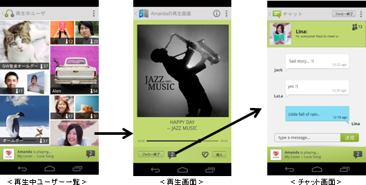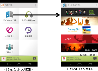 「セレクトチャンネル」や「マイチャンネル」を再生している複数のお客さまと一緒に音楽を聴き、チャットをすることができます。加えて、「LISMO unlimited powered by レコチョク」を利用して音楽を再生しているお客さまも、「うたパス」の会員と一緒に音楽を聴いたりチャットすることが可能です。