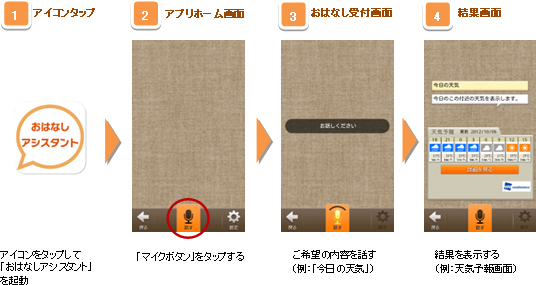 「おはなしアシスタント」アプリを起動し、画面下中央のマイクボタンをタップし、お探しのアプリの名称や、ご希望の内容を話しかけていただきます。